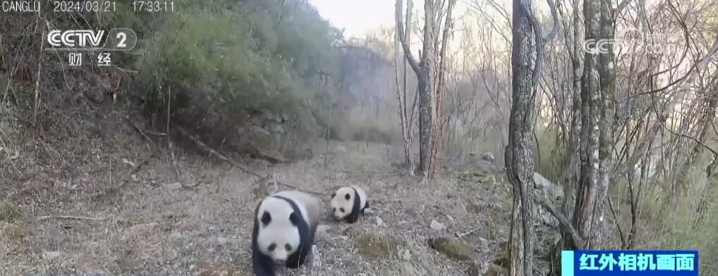 海拔约1500米位置的红外相机拍摄到另一对熊猫“母子”,这段视频中大熊猫幼崽明显体形更小,走起路来摇摇晃晃,憨态可掬。近年来,长青国家级自然保护区内,野生大熊猫种群规模稳步增长,红外相机也越来越多记录到野生大熊猫“母子同框”的画面。