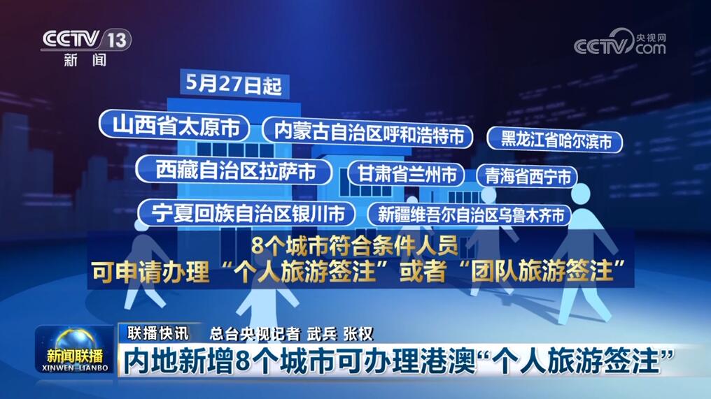 中国出入境管理局今天(5月11日)发布公告,经国务院批准,5月27日起,山西太原、内蒙古呼和浩特等8个城市的符合条件人员,可向当地公安机关出入境管理部门提交申请,办理往来港澳“个人旅游签注”或者“团队旅游签注”。