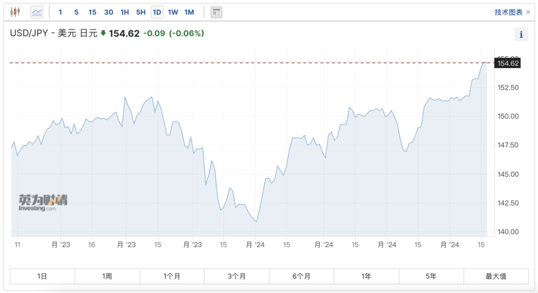 在强势美元的“攻势”下,亚洲货币正在面临一场大风暴。包括日、韩在内的亚洲国家货币遭遇巨大贬值压力。其中,美元兑韩元一度升至1400的关键整数位,创下2022年10月以来新高;美元兑日元曾一度触及154.78,连续第四个交易日创1990年来新高。
