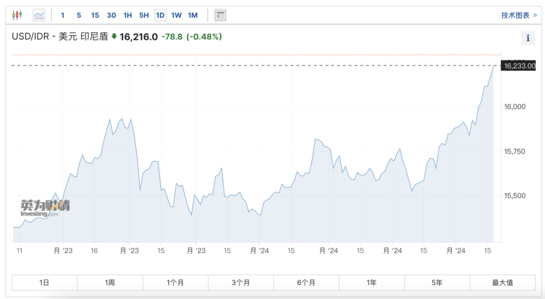 其中,印尼盾为跌幅最为猛烈的亚洲货币之一,4月16日一度重挫逾2%,跌至四年低点;4月16日,美元兑越南盾日内一度触及25295,创纪录新高;4月17日,菲律宾比索自2022年末以来首次跌破57比索这一关键水平,加剧该国央行干预货币市场压力;印度卢比持续下行,截至发稿,美元兑印度卢比汇率报83.69,已位于历史高位。