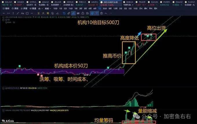 ZEC机构洗筹、洗筹区域在35-43区间, 算上时间成本、资金成本折算在50刀,而目前价格最高450,接近10倍,一般机构操盘一个币目标3-5-10倍。