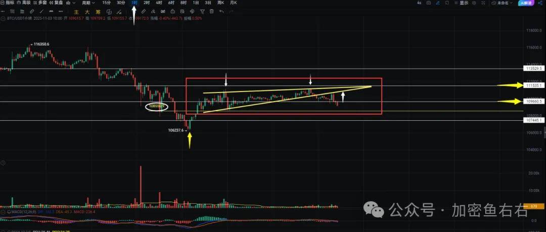BTC已经震荡近4个月了,市场多空分歧严重,上方阻力位有点强,两次向上突破111535都失败了,并且三角收敛形态被跌破109660支撑也被跌破,如果108550颈线位跌破,红框圈出的这段多头趋势就结束了。