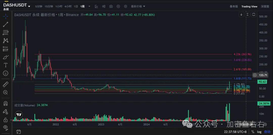 DASH周线级别,大周期三重W底反转结构,等待DASH币突破80U,成交量也量价齐升,值得关注。