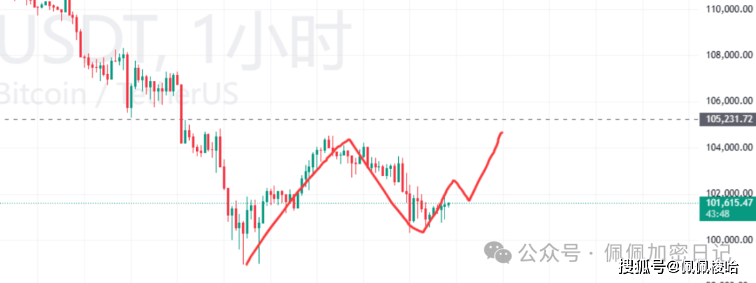 昨天的反弹力度一般,目前受到104500的压制,突破它会形成小级别双底形态,才能增加反弹的空间,否则继续向下 ,目前BTC小级别连续收针,短期有反弹需求,可以现价101500附近入手多,留补仓位置即可,防守参考10w整数支撑,目标104500。