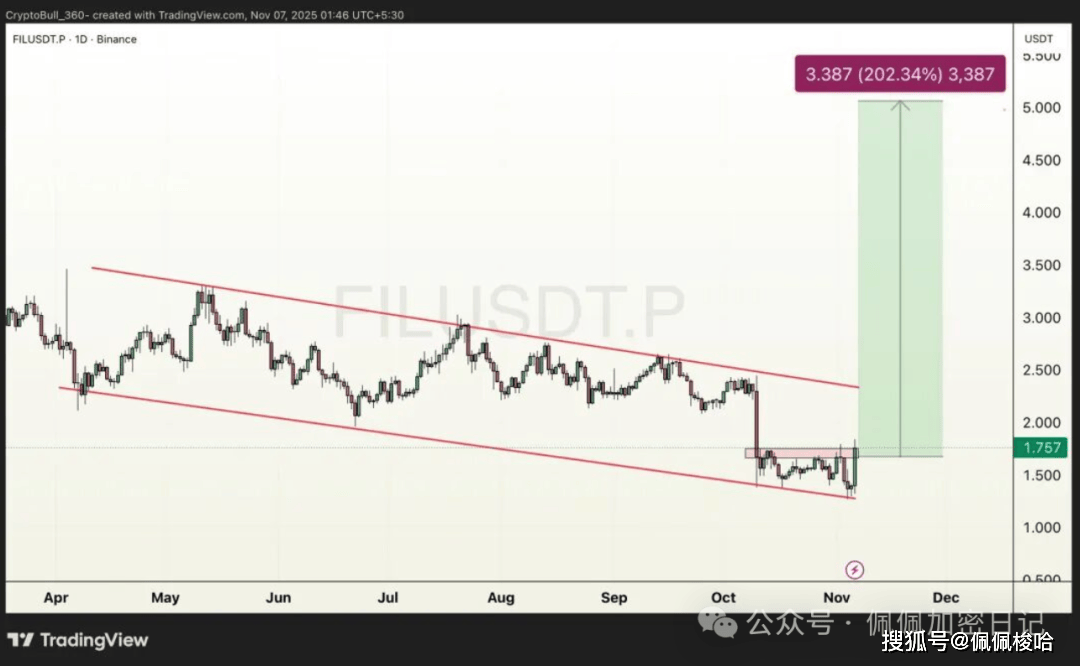 存储板块,FIL较历史最高点下跌了98.5%。随着$ICP的上涨,资金开始炒作$FIL,FIL正准备突破日线图上的下降通道形态,看起来像是骗局式的拉升,成交量正在上升,请密切关注预计下周将从突破区域上涨 150-200%!