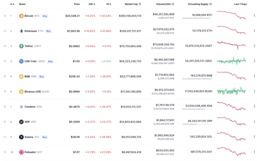 在比特币和以太坊领跌之外,除了部分稳定币,体量前十的加密币种近7日的跌幅均超过20%。加密货币市场体量缩水。据CoinMarketCap统计,截至UTC时间6月14日8时,加密货币市场总市值为9449亿美元,不足万亿美元。