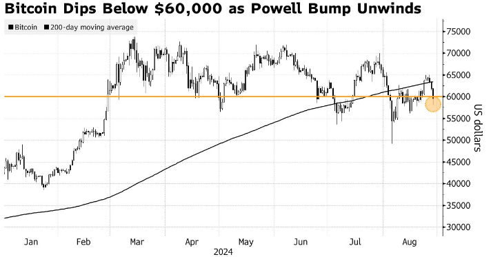 上周,美联储主席鲍威尔发出了迄今为止最明确的暗示,即美联储正准备将基准利率从20多年来的高点下调。IG Australia Pty的市场分析师Tony Sycamore表示,对许多资产来说,“美联储基本上都在发挥作用”,这使得比特币跌破200日移动平均价格“有点令人担忧”。