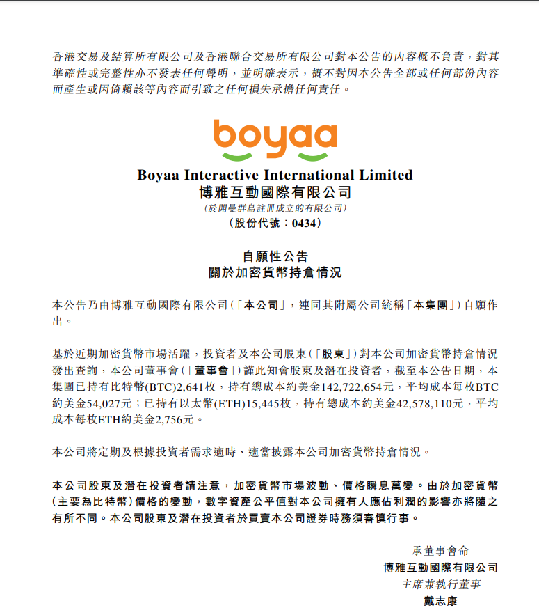 博雅互动(HK00434)11月12日晚间发布公告称,截至公告日期,公司已持有比特币2641枚,总成本约1.43亿美元,平均成本约5.4万美元/枚;已持有以太坊1.54万枚,总成本约4257.81万美元,平均成本约2756美元/枚。