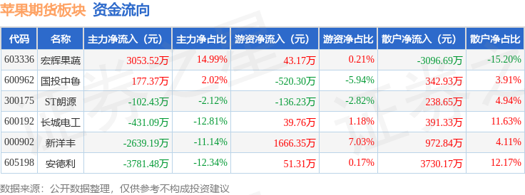 从资金流向上来看,当日苹果期货板块主力资金净流出3723.3万元,游资资金净流入1144.06万元,散户资金净流入2579.24万元。苹果期货板块个股资金流向见下表: