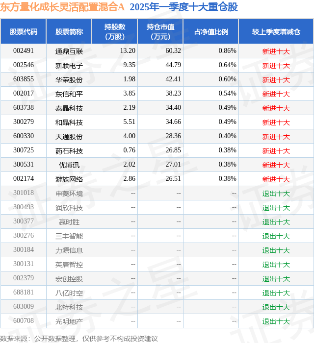 根据2025基金Q1季报公募基金重仓股数据,重仓该股的公募基金共1家,其中持有数量最多的公募基金为东方基金的东方量化成长灵活配置混合A。东方量化成长灵活配置混合A目前规模为0.62亿元,最新净值1.3382(5月21日),较上一交易日下跌0.73%,近一年上涨26.34%。该公募基金现任基金经理为王怀勋。王怀勋在任的基金产品包括:东方量化多策略混合A,管理时间为2022年5月17日至今,期间收益率为-8.16%。