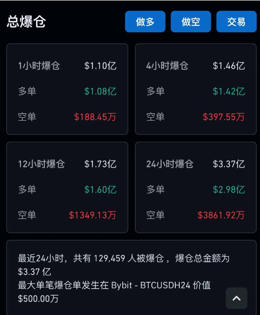 衍生品交易方面,CoinGlass数据显示,截至1月23日21时,24小时虚拟货币全网爆仓人数近13万,爆仓总金额高达3.37亿美元(约合人民币24.2亿元)。其中多单爆仓2.98亿美元,空单爆仓超3860万美元。