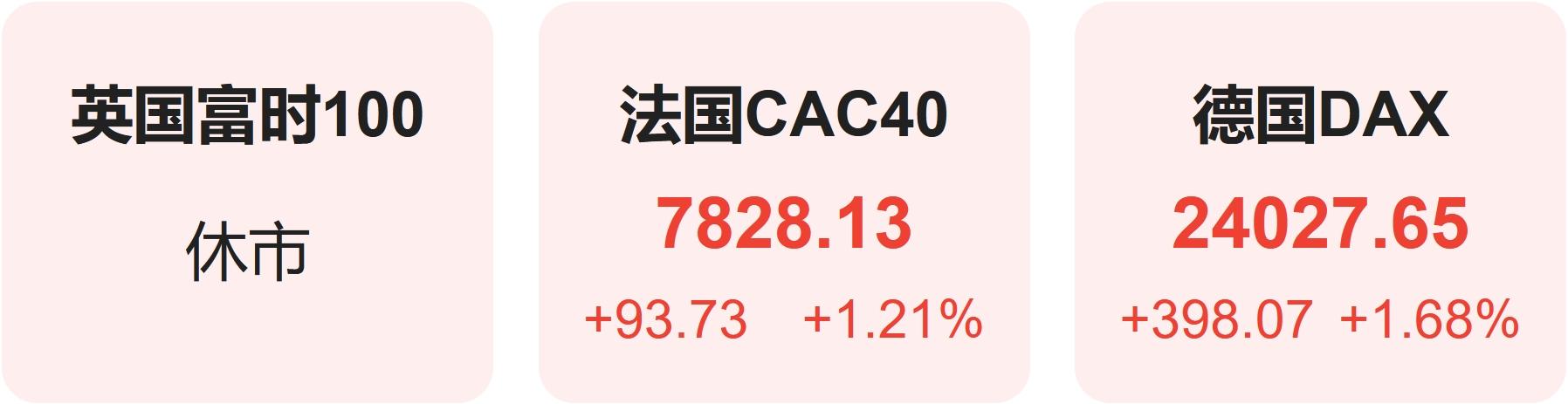 欧洲股市方面,欧洲斯托克50指数1.3%,法国CAC40指数上涨1.21%,报7828点。德国DAX指数上涨1.68%,报24028点。