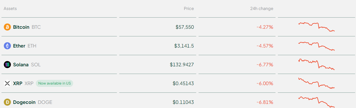 根据Bitstamp的报价,比特币现报57,550美元,以太坊报3,141美元,近24小时双双跌超4%;Solana、瑞波币和狗狗币均跌超6%。