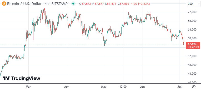 周四(7月4日)欧洲时段,加密货币集体下行,其中比特币一度跌破57,000美元关口,最低报56,952美元,创两个多月来的最低水平。