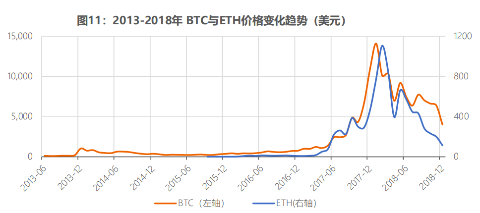 加密货币在2017-2018年有一段较短暂的牛市(图11),在2018年阶段性地达到了市值高峰,这一时期主要是由ICO热潮推动。
