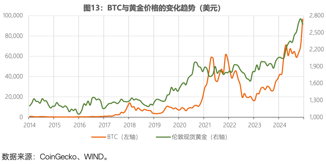 第五,比特币在特定情境下展现出与黄金类似的避险功能(图12、图13)。2020年以后,比特币价格、黄金价格和纳斯达克指数之间的关系经历了明显变化。新冠疫情初期(2020年3-4月),三者均在短暂下跌后反弹,但表现节奏和力度各异:纳斯达克在科技股带动下率先强势回升,黄金因避险需求稳步上涨,而比特币波动最为剧烈。随后在全球流动性宽松期(2020下半年至2021年初),比特币与纳斯达克呈现显著正相关性,显示其作为风险资产的特征,而黄金在2020年8-9月创下历史新高后走势分化,进入回调阶段。2021年通胀上行期间,这种分化进一步加剧,纳斯达克持续创新高,比特币经历两轮显著上涨,而黄金表现相对平淡。