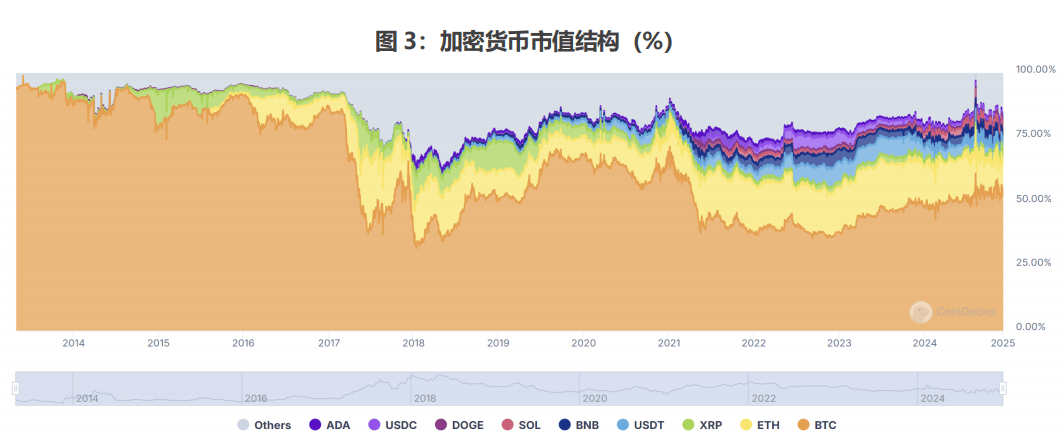 过去十年,加密货币经历了从比特币单一主导到多元化发展的过程。2017年以前,比特币处于绝对主导地位,占全部加密货币市值的75%以上。2017-2018年,随着以太坊智能合约平台的兴起,以太币市值占比达到了约31%的峰值,比特币占比降至约33%的历史低点。