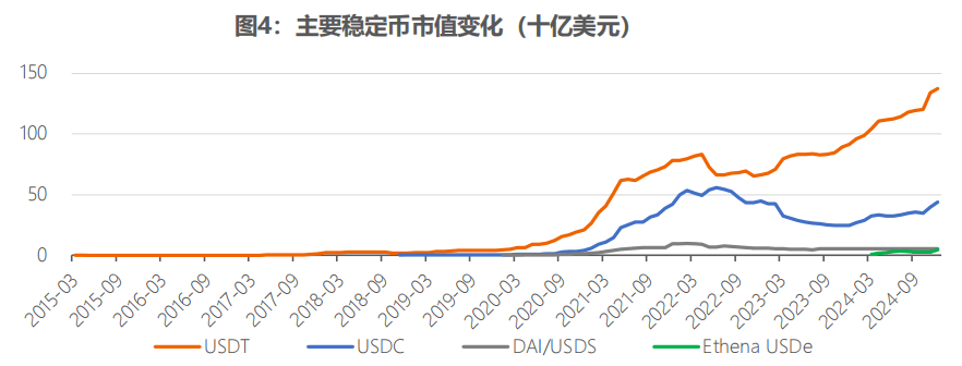 一是稳定币市值规模稳步提升。稳定币在2019年之前发展相对缓慢,2020年以后经历了爆发式增长。截至2024年12月,稳定币总市值达到2110亿美元,占全体加密货币市值的6.12%。