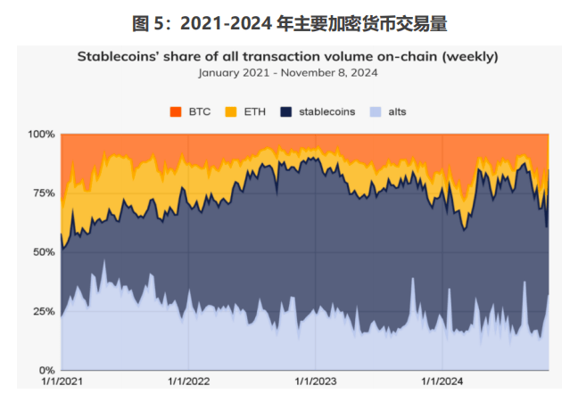 二是稳定币的应用场景正在逐步拓展。近几个月,稳定币以5%-7%的市值,承担了全体加密货币约三分之二的交易量(图5)。值得注意的是,这些交易可能主要体现为资产交易性质,而非日常消费支付。
