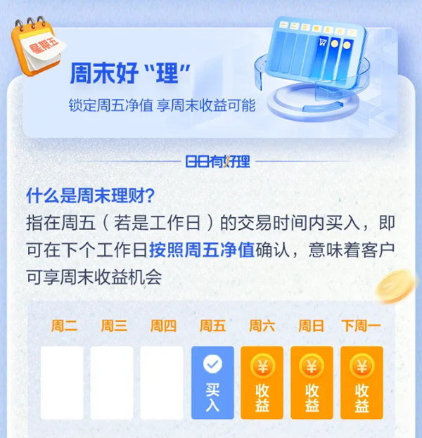 “周末理财”指在周五(若是工作日)的交易时间内买入,即可在下个工作日按照周五净值确认,意味着客户可享周末收益机会。