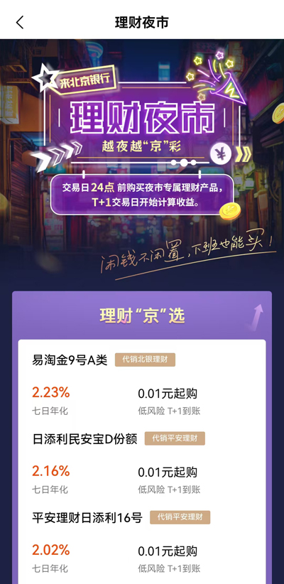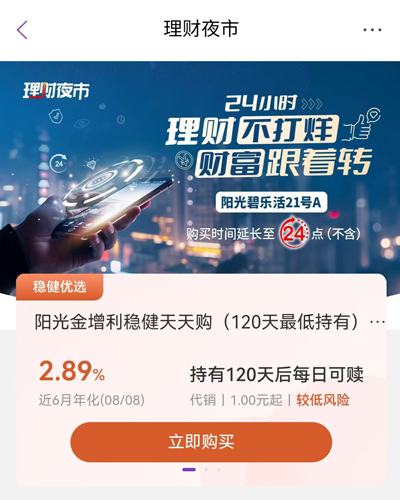 例如,光大银行APP再度上线了“理财夜市”专区,推出了一款24小时理财产品,投资者可以在交易日24点前申购或赎回,视同当日(T日)申购,T+1日计算收益或到账。