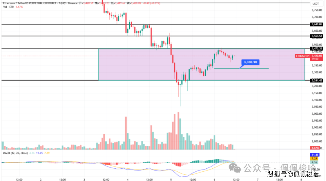 ETH超跌反弹,巨鲸/机构不断抄底ETH,已成功反弹形成双底形态,MACD金叉确认,成交量柱状放大显示买盘介入,目前处于3241-3473宽幅箱体震荡。