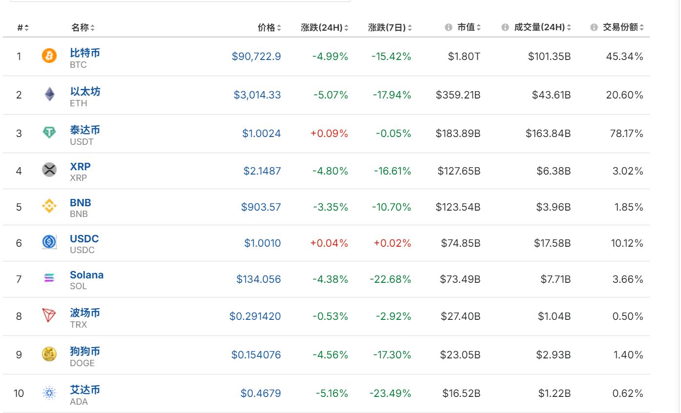 截至发稿,比特币报90722.9美元,跌幅4.99%。以太坊、艾达币跌超5%,狗狗币跌4.56%。