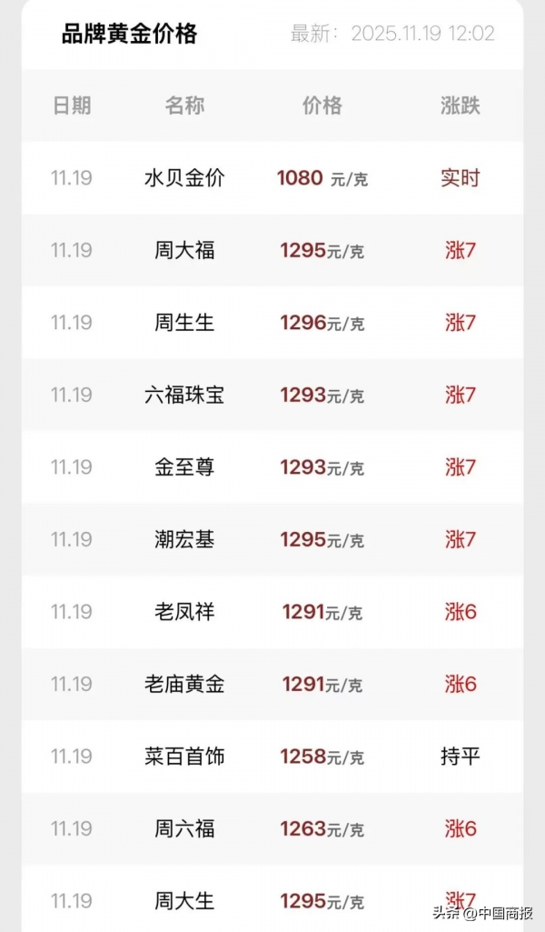 北京时间11月19日,国内品牌金饰价格上调,结束四连跌。周生生足金饰品报1296元/克,较前一日的1289元/克涨7元/克;老凤祥足金饰品报1291元/克,较前一日的1285元/克涨6元/克。