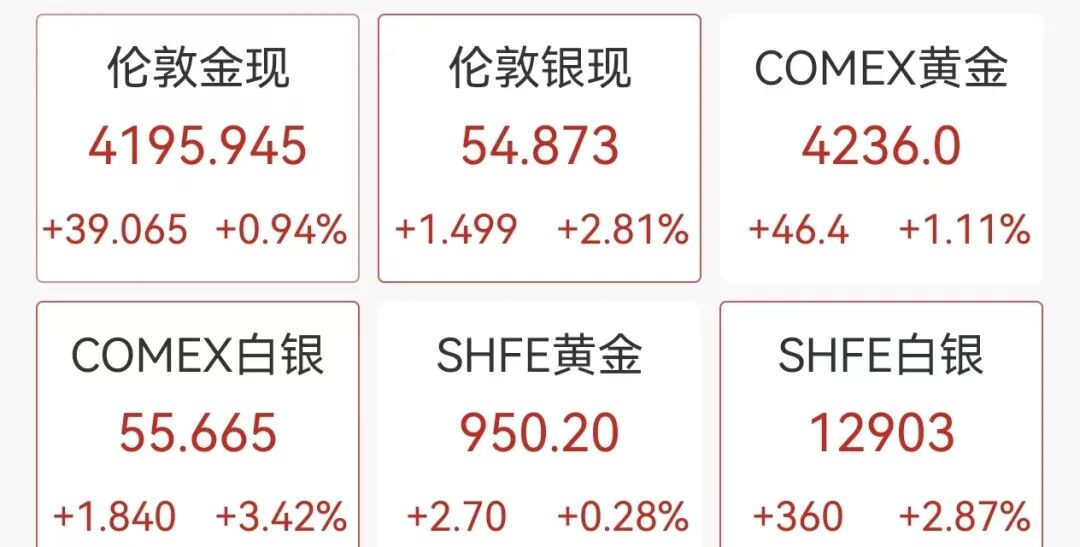 现货黄金向上触及4200美元,日内涨约1%。现货白银日内涨幅一度扩大至3%,上期所沪银期货也涨近2.9%,双双刷新近期新高;纽约期银涨2.8%。美股白银矿商跟随白银上涨,赫克拉矿业上涨4.4%,科埃尔矿业上涨3.6%,恩迪沃银业上涨6.5%。