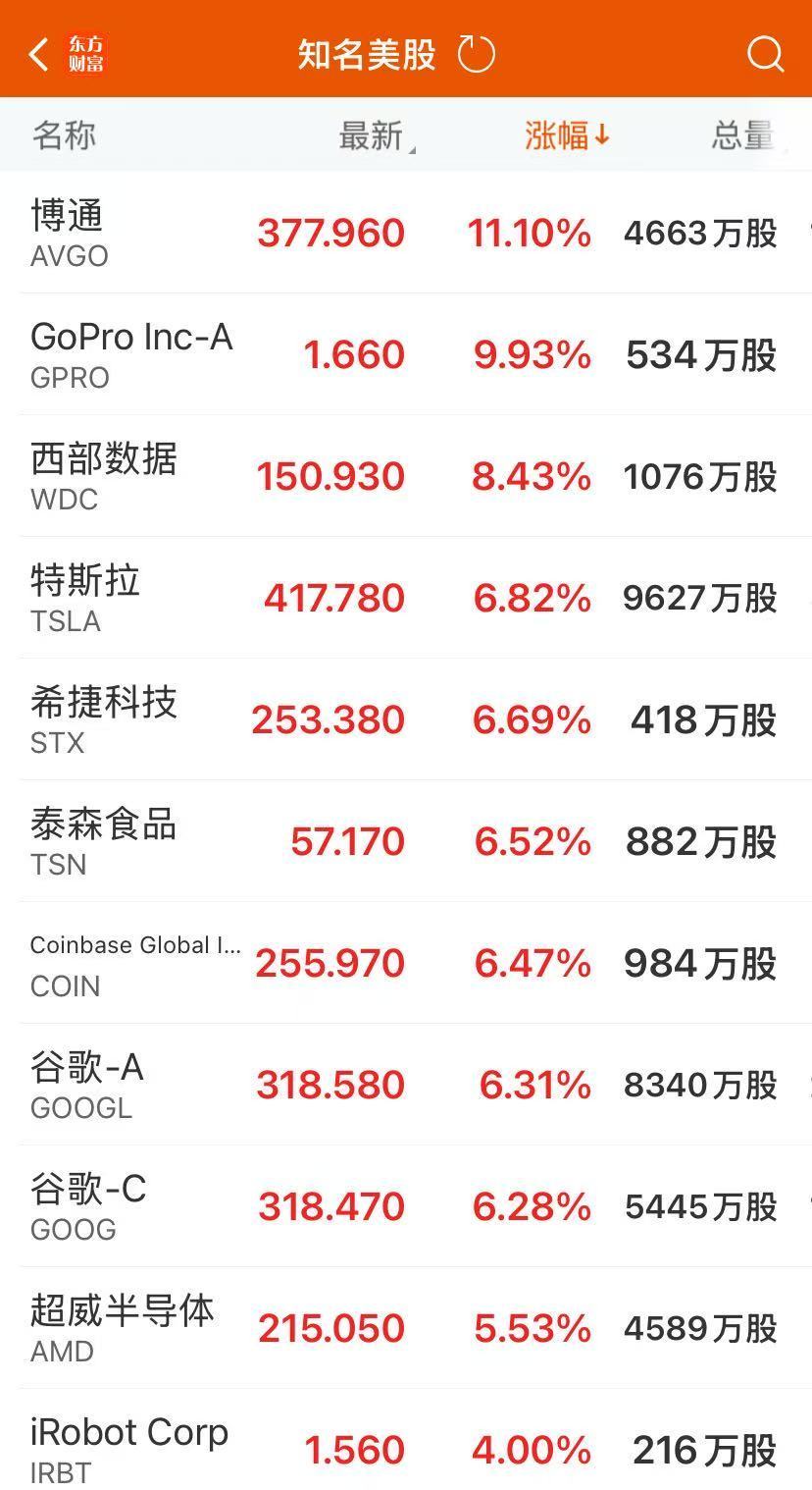 芯片股走强,博通股价上涨11%,创4月份以来最大涨幅,市值增加1780亿美元(约合人民币1.264万亿元);费城半导体指数涨4.6%,美光科技涨近8%,AMD涨超5%,英伟达涨超2%。